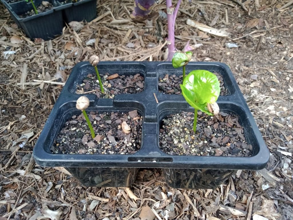 I still had some seedlings in seedpods that were starting to grow and I knew I had to get them into a better, cooler location. Fortunately there is some Kale growing in the raised bed that I planted the coffee seeds. The kale was getting past its use by date and the moths had been sowing their eggs into their leaves. They were being decimated by the little caterpillars. But they provided a lot of shade.