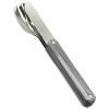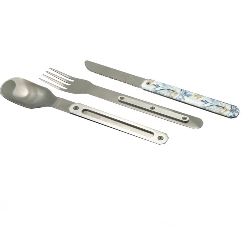 Cutlery in martensitic stainless steel 2CR14, polished mirror finish. Comprises a large spoon, a 4-pronged fork and a knife with a micro-serrated blade. Decorated transparent polymer handle. Magnetic assembly.