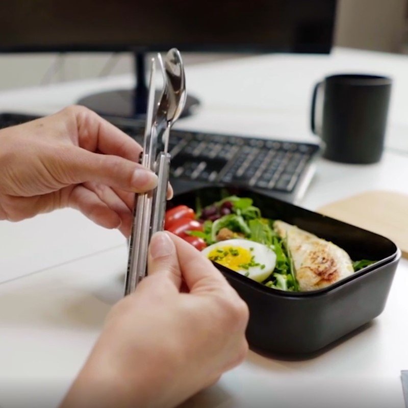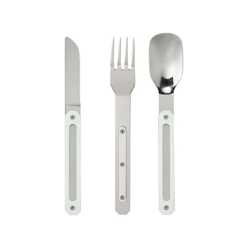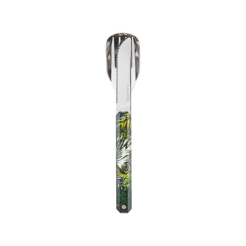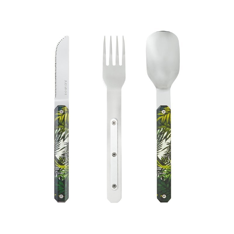 Cutlery in martensitic stainless steel 2CR14, polished mirror finish. Comprises a large spoon, a 4-pronged fork and a knife with a micro-serrated blade. Decorated transparent polymer handle. Magnetic assembly