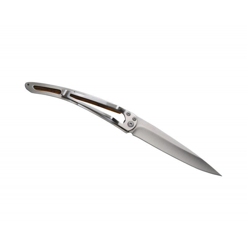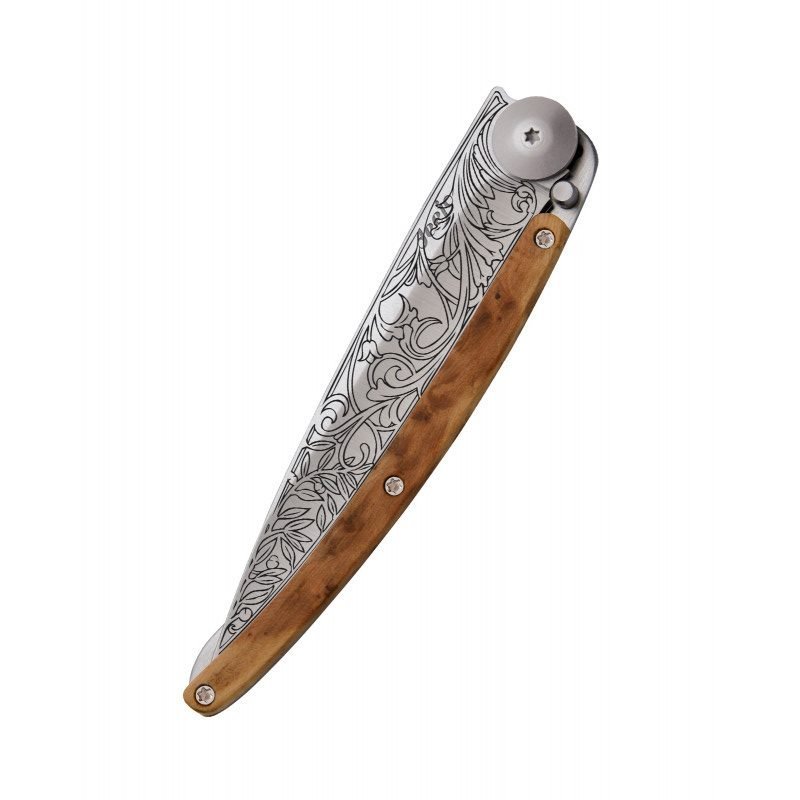 Knife with Art Nouveau design by Deejo. Very light (37gr) with matte finish. This is made from 420 stainless steel. Juniper wood handle slab.
