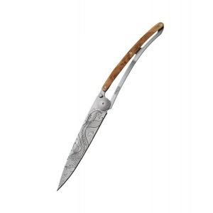 Knife with Japanese fish design by Deejo. Very light (37gr) with matte finish made of 420 stainless steel. Juniper wood handle slab.