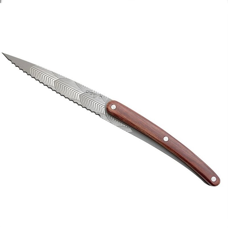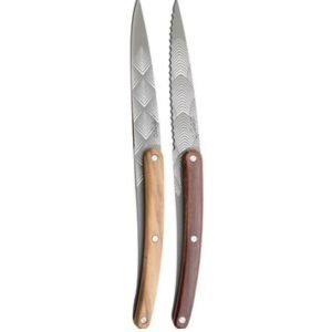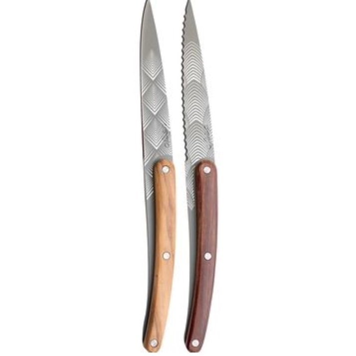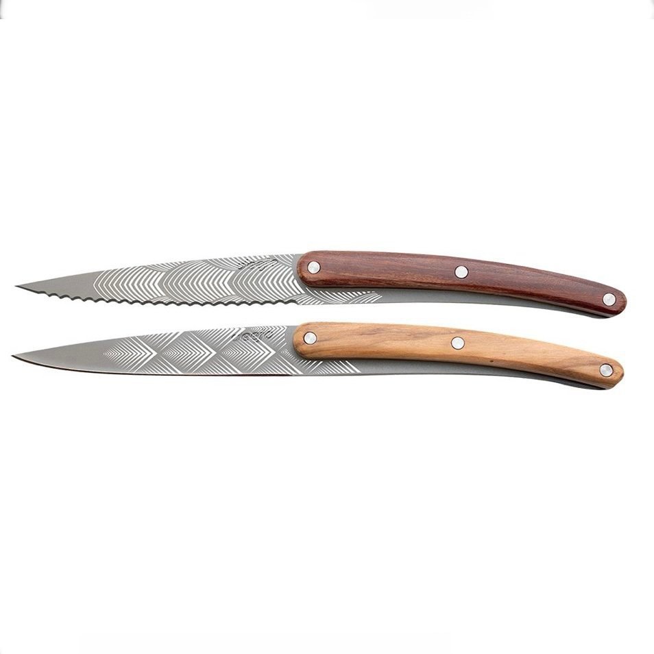 Set of 2 fixed blade paring knives (not folding) in 2CR14 stainless steel, anthracite grey titanium finish. The blade of the first knife is razor sharp and its handle is decorated on both sides with an olive wood plaque. The blade of the second knife is micro-serrated and its handle is decorated with a coral wood plaque on both sides.