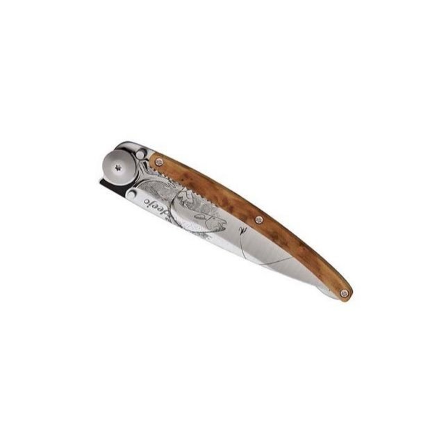 Ultra-light knife in Z40C13 stainless steel, matte finish. Secure liner lock system decorated with fine laser engraving. Belt clip. Solid Juniper wood handle slab.
