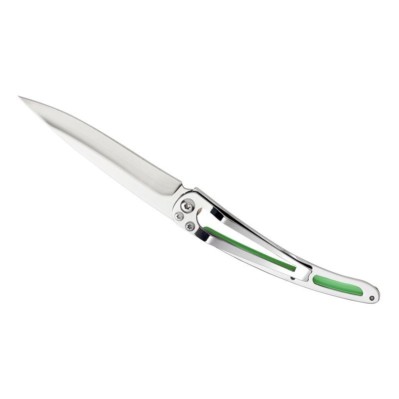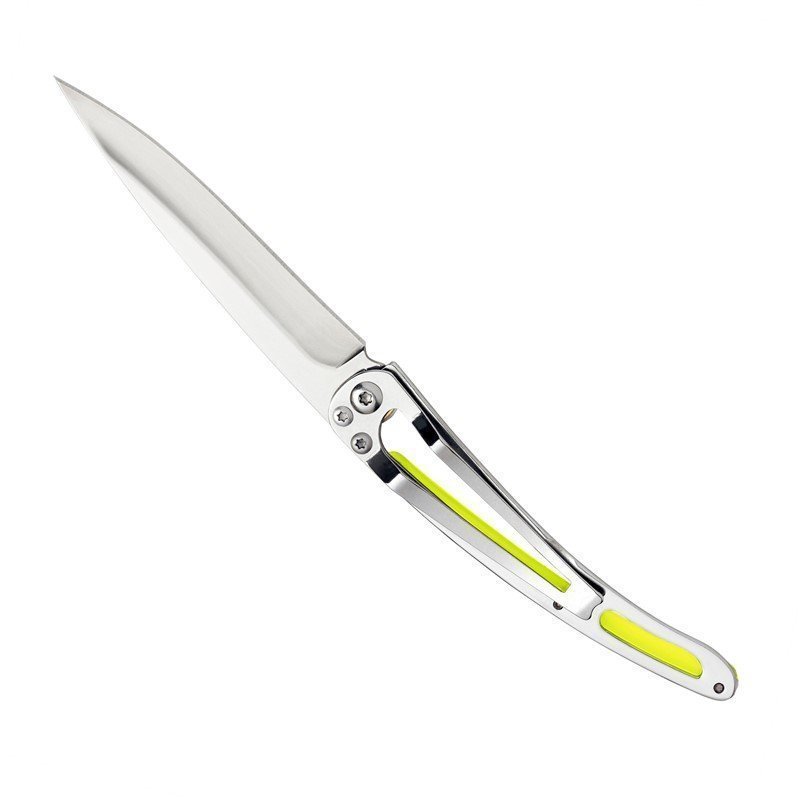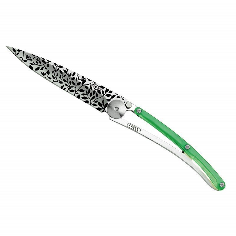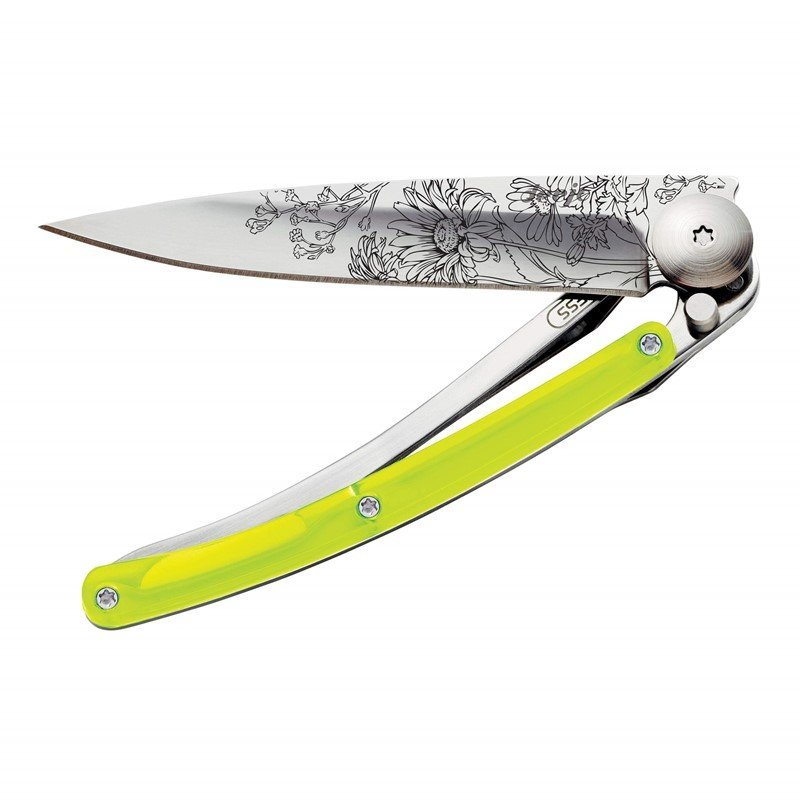 Knife with flower design by Deejo. Very light (27gr) with mirror finish made of 420 stainless steel. Yellow translucent polycarbonate handle slab.