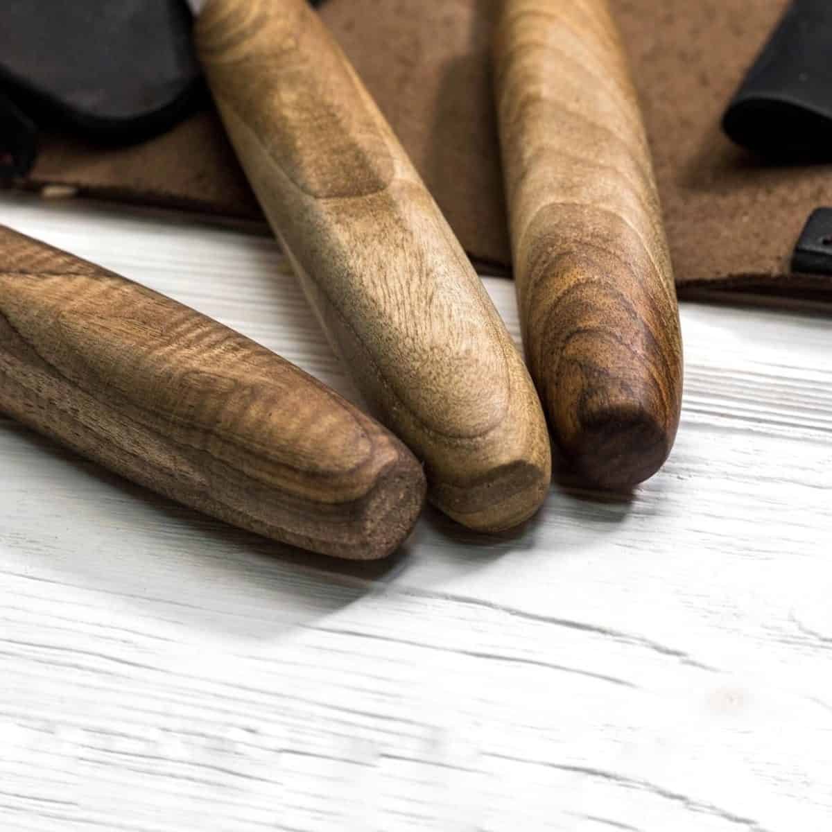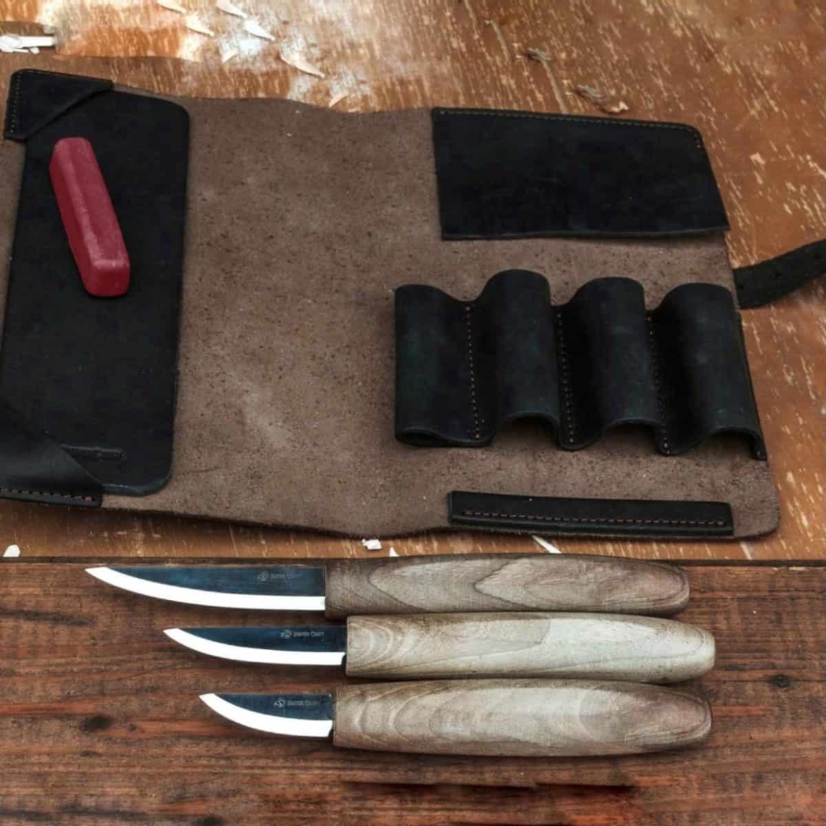 The BeaverCraft S19X Premium Whittling Set includes 3 whittling knives for various purposes, a tool roll, a black leather strop, and a polishing compound. With our sloyd knife, you’ll be able to make small cuts and do delicate work, mini-sloyd knife would be useful for extremely small cuts, and a whittling knife – for general woodcarving.