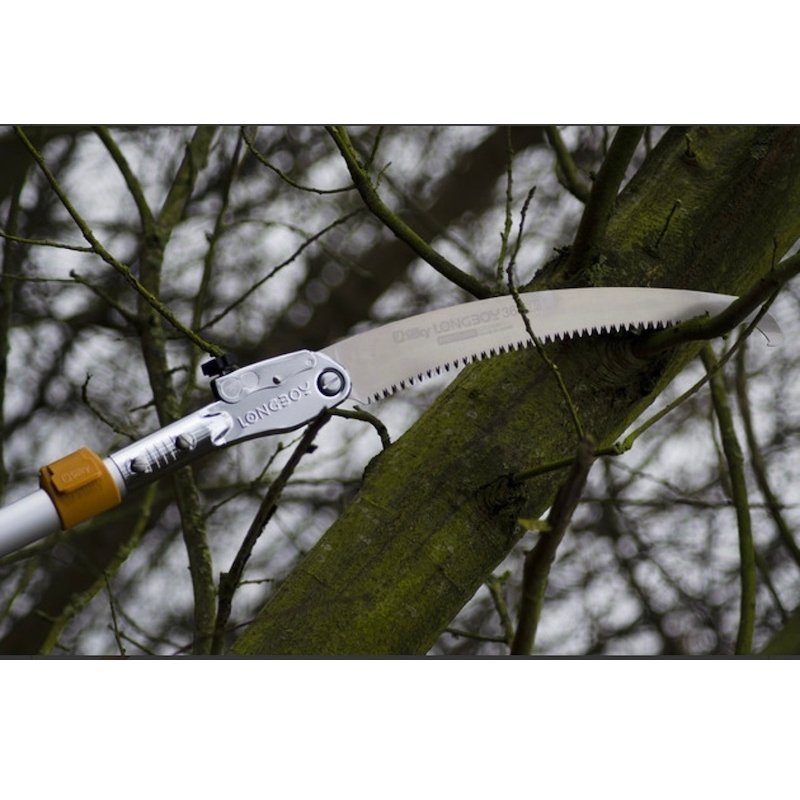 The Silky Longboy also features a dual-locking system, consisting of a pin/button lock and a clamp, working together to prevent any collapse or damage to the unit. The poles are made of lightweight aluminum alloy, making it easy to handle and maneuver, while still providing strength and stability. The pole also includes a comfortable rubberized overgrip, ensuring a secure hold, and a pole-end shock absorber to protect against slight impacts with the ground. Overall, the Silky Longboy Telescopic Polesaw is a versatile and reliable tool for both professional and home use.