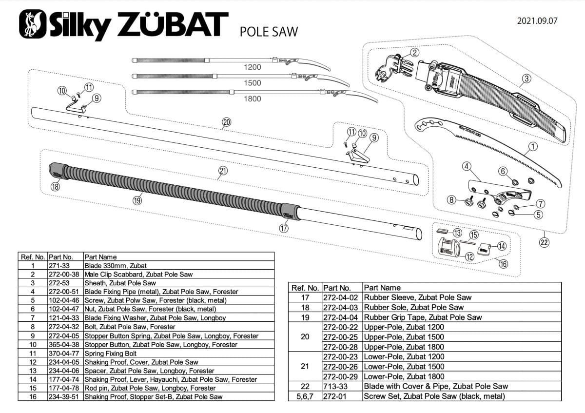 Zubat Pole Saw Parts are easy to remove and install. Parts should last a very long time. Silky saws Japan has been manufacturing these saws for over 100 years. They began in 1919.